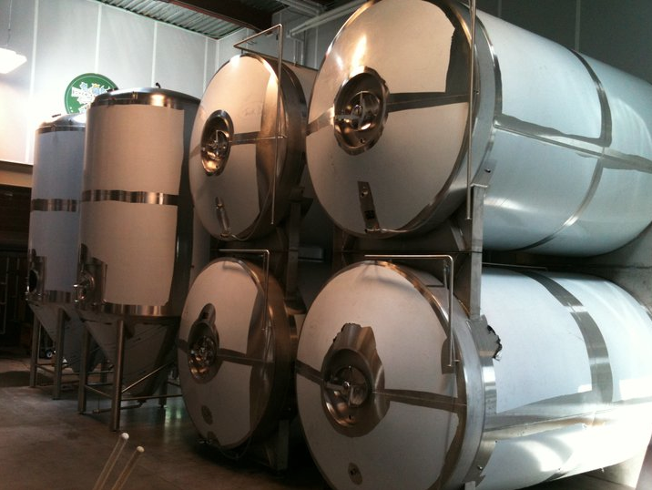 We spent the whole day unloading and positioning the 4 new 90bbl lagering tanks into place. They don't look that big in this picture but each one is about 10 feet tall just so you see the scale. The fermenters behind them are about 25ft tall.